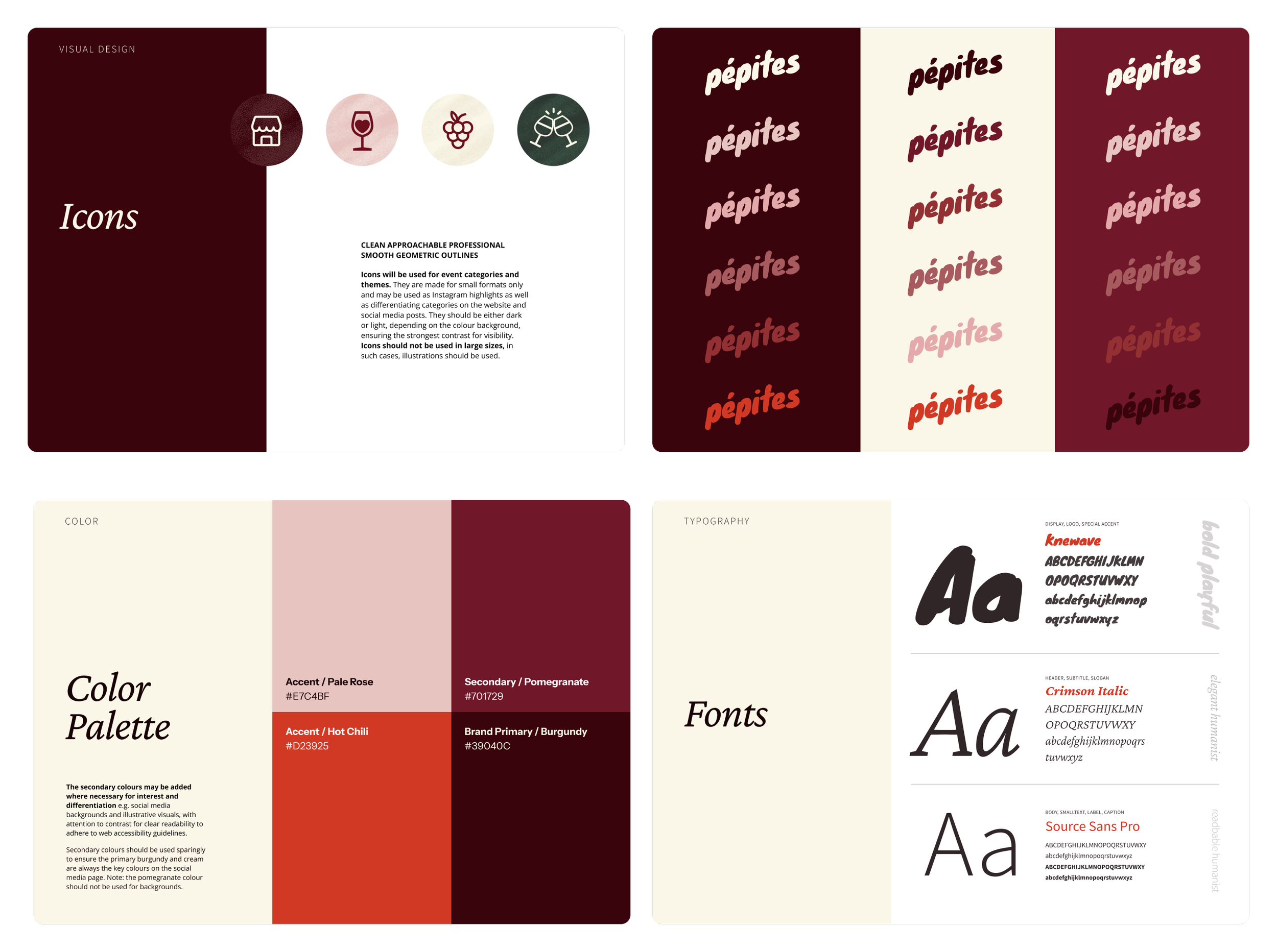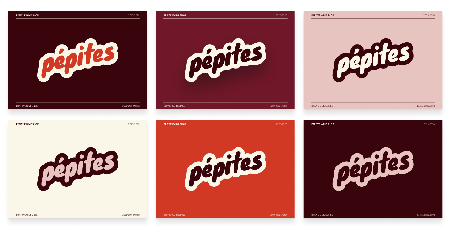 Polished, cohesive, eye-catching visual branding, refined via design feedback cycles, reflects the personality and values of Pépites and its target clients.